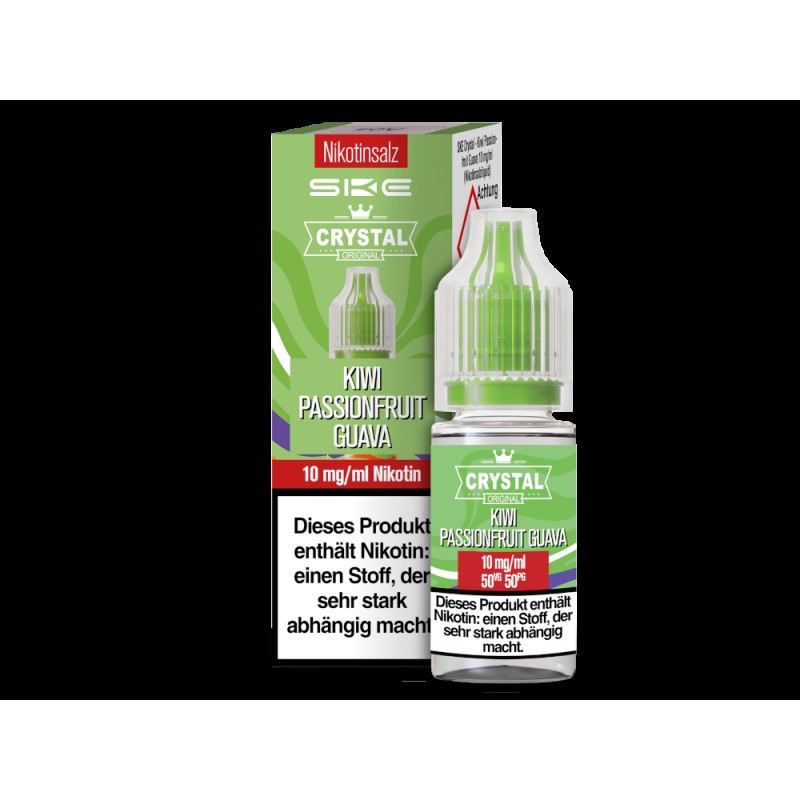 Pro 10 ml Flasche erhalten Sie Niktoinsalz Liquid der Marke SKE. Die Sorte Crystal Kiwi Passionfruit Guava entfaltet beim Verdampfen mit einer E-Zigarette den Geschmack von Passionsfrucht, Kiwi und Guave. Die Stärke der SKE Nikotinsalz Liquids beträgt 10 mg/ml und 20 mg/ml.